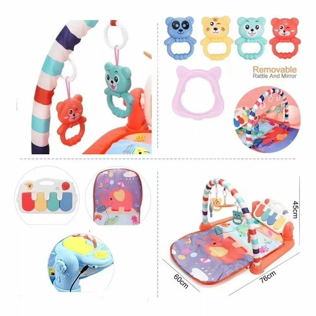 Activa constantemente a tu bebe con música al tocar el piano con los pies. Manta actividades para bebe harán que mejore su motricidad y fuerza. El Bebe usa sus manitas para coger los juguetes que colgaban del arco, estimula los sentidos del bebé. Los bebés patean el piano y jugar con los juguetes colgados. Alfombras gimnasio bebes con piano es genial para entretener a un bebé un largo rato. El arco del gimnasio es muy resistente y flexible, no teme que el bebé tire con fuerza. La altura del arco es adecuada para que los bebés atrapen con éxito los juguetes sonajeros. El bebe puede jugar de 3 formas: boca abajo, boca arriba y sentado jugando con el piano.